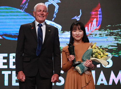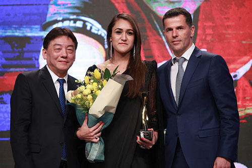 伊藤美誠(右)は世界卓球2018のMVP なお、ITTFスターアワードの発表とあわせて、世界卓球2018ハルムスタッドのMVPの発表も行われた。MVPを受賞したのは伊藤美誠(日本)。大会時17歳だった伊藤の活躍によって、日本女子は銀メダルを獲得した。