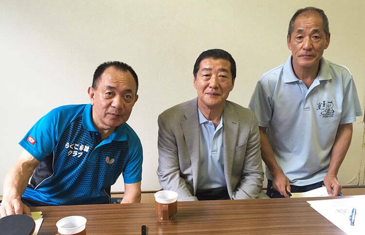 左から小遊三さん、大月市の石井市長、大月市卓球連盟の橋本会長