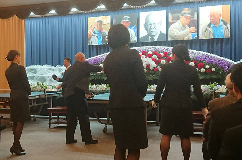 会には卓球界の関係者が大勢出席し、木村興治さん、兒玉圭司さんが弔辞を述べた。会場には卓球台、ラケット、ボールが用意され、「献花」ではなく「献球」として出席者ひとりひとりが祭壇にボールを打ち入れた。終始和やかな雰囲気の会だった。