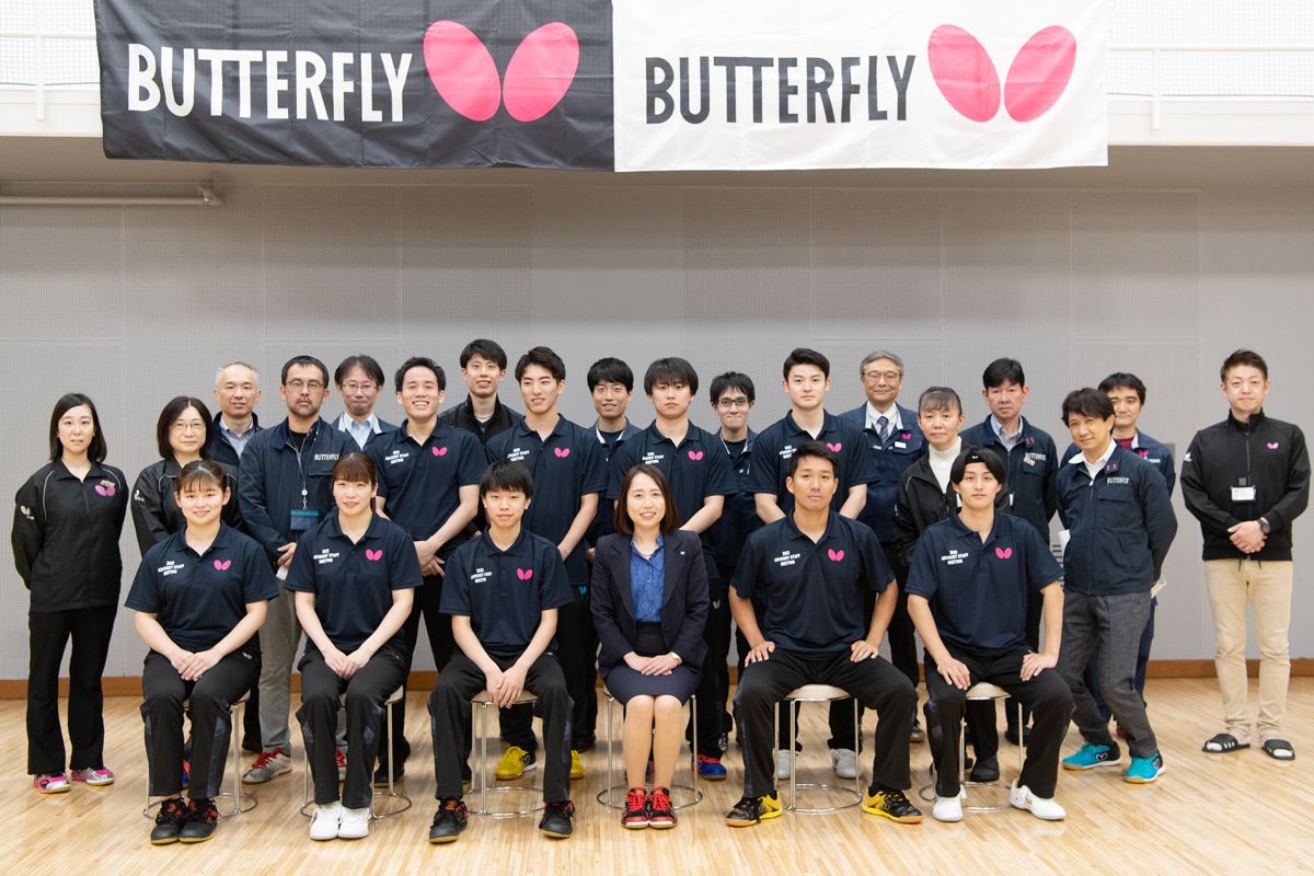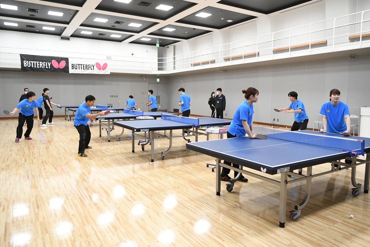 イベントに参加したバタフライ・アドバイザリースタッフは高木和卓(千代田クラブ)、平野友樹(協和キリン)、有延大夢(琉球アスティーダ)、鈴木李茄(トップおとめピンポンズ名古屋)、酒井明日翔(シチズン時計)、三部航平(シチズン時計)、松山祐季(協和キリン)、木村香純(トップおとめピンポンズ名古屋)、渡部民人(星槎中学校)の9人。これほどのバタフライファミリーが卓球道場で一堂に会する機会はめったにない。