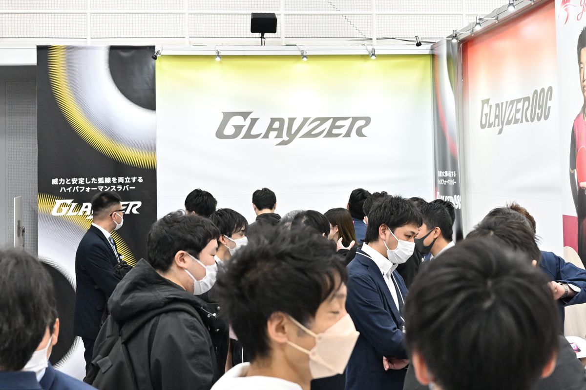 とりわけ大きな注目を集めたのは、ディグニクスシリーズの技術を用いて開発したシートとスプリング スポンジXを搭載した新ラバー『グレイザー』と『グレイザー09C』だ。多くの卓球ショップのスタッフが試打会場に用意されたテスト用ラケットを手に取り、その感触をしっかりと確かめていた。
