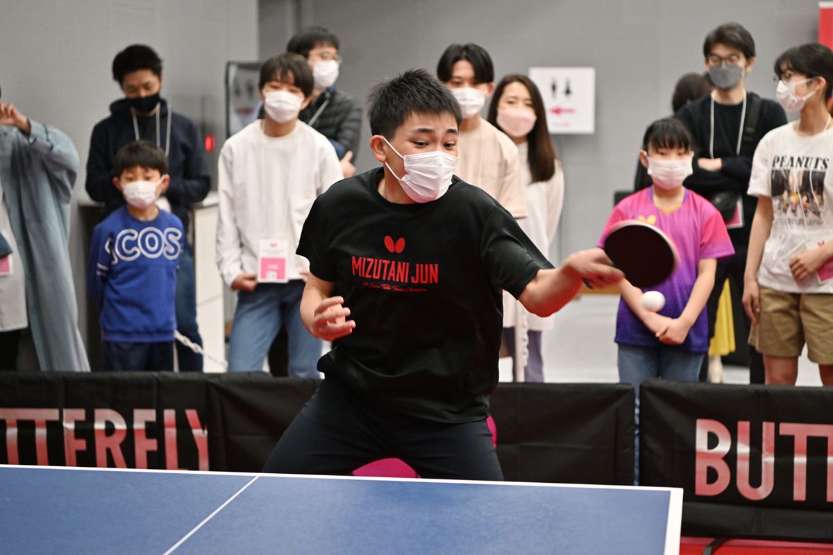 水谷氏が「ベストバランス」と推奨する『水谷隼 メジャー』と『ロゼナ』を組み合わせたラケットを手に取り、現役時代を彷彿させるダイナミックなラリーを披露し、会場を大いに盛り上げた。