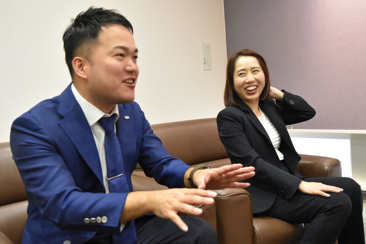 激励した佐藤亮(左、ラバー生産担当取締役)と大澤卓子(右、代表取締役社長)