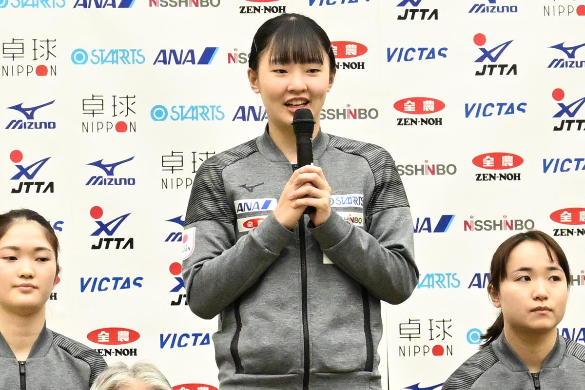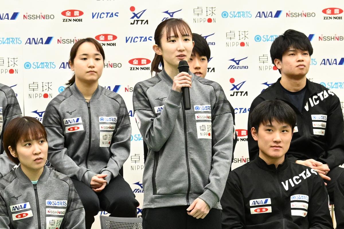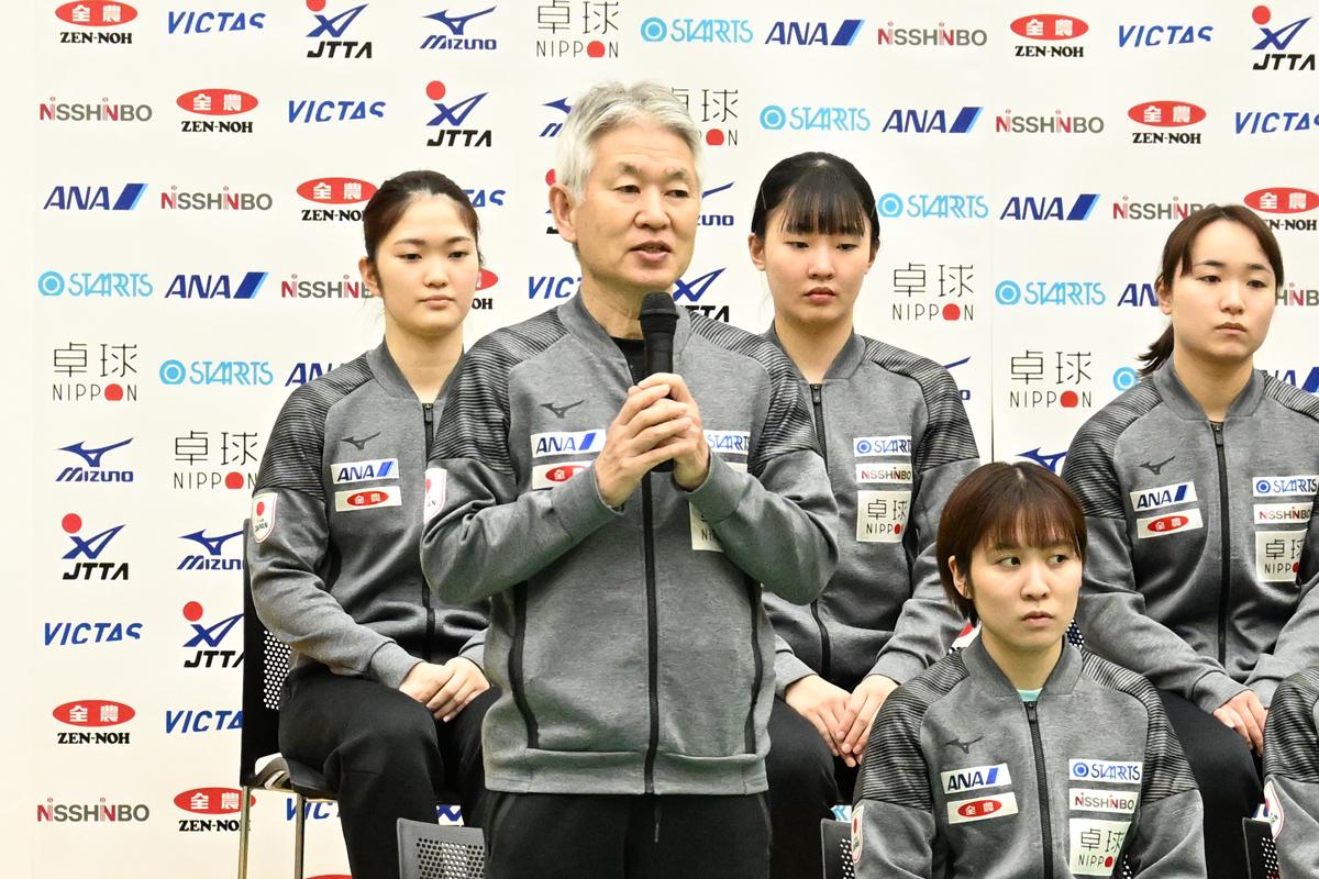 記者会見には男女の日本代表選手と両監督が登壇。日本卓球協会会長の河田正也氏の激励のあいさつに始まり、両監督が世界卓球にかける意気込みを述べた。