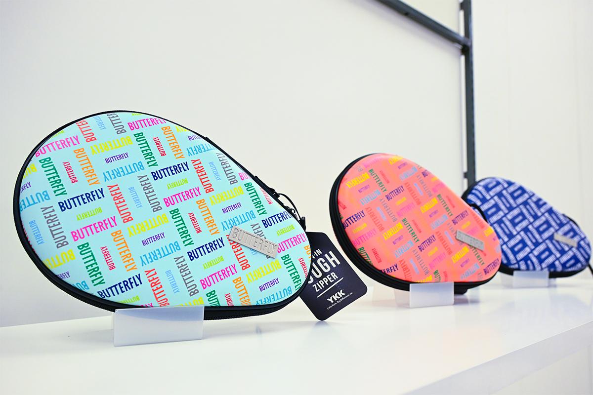 そのほかの新商品では、カラフルかつ動きを支えるワイドヒール仕様の『ショートカラー・ソックス3』、バタフライのロゴマークを格子柄にちりばめた『ロスモア・ハードフルケース』、バタフライの主要な裏ラバーの製品名がプリントされたサイドテープ『HT・プロテクター』などが関心を集めた。