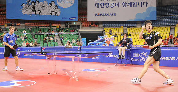 女子ダブルスは地元韓国の金?娥/朴美英が粘りのカットプレーで姜華君/帖雅娜を強打をしのぎきり優勝し会場も大興奮に包まれた。