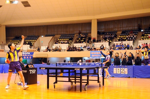 試合は1番で木造が蛭田をストレートで退けると、2番は松山祐季対羽佳のハイレベルなラリー戦。お互いに1歩も引かない試合展開で1発のパワーで勝る羽佳が2−1とリードしたが、松山が快速両ハンドで2ゲームを取り返し逆転勝ち。しかし、ダブルスは沼村・佐藤が太田・松山洋季をきっちり3-0で破り、1点を返上。2台進行で4番、5番が同時進行だったため、5番で大西が五十嵐を破り愛工大附属の勝利は決まったが、4番の髙見対吉田も続行。吉田もラリーで粘り強さを見せたが、決定力で勝る髙見が3-1とし初優勝を決めた。
