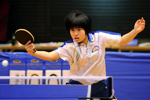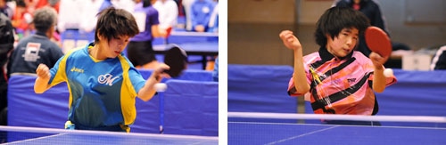 女子決勝は武蔵野(東京)と横浜隼人(神奈川)の関東勢対決となった。武蔵野は1,2番でエース格の鹿股、田巻(写真)が2点を挙げ一気に王手。しかしここから横浜隼人が粘りを見せ、3,4番を取り返し勝負はラストに。ラストは武蔵野の2年生永井が堅実な両ハンドで林をストレートで退けて優勝を決めた。武蔵野は平成13年度の第3回大会以来、11年ぶり2回目の優勝となった。