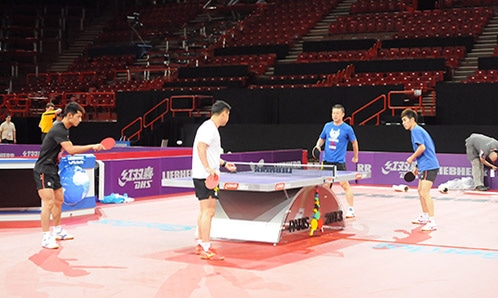 昨日から各チームが本会場で練習を開始しているが、12日は中国チームが登場。張継科、王皓ら世界チャンピオンをはじめ、馬龍、許昕、馬琳など優勝候補が感触を確かめながら、汗を流した。