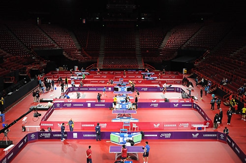 5月12日、世界卓球2013パリの大会初日前日。会場のベルシー体育館(Palais Omnisport de Paris Bercy)は、まだ設営中だが大会公式の卓球台に赤いフロアマットが敷かれ、傾斜の強い観客席にはすでに熱狂の予感に満ちている。