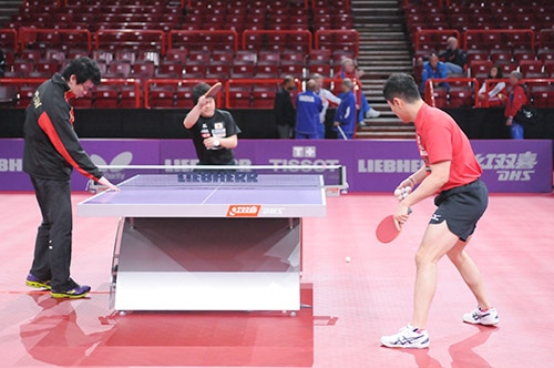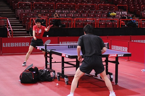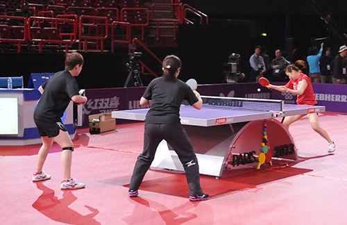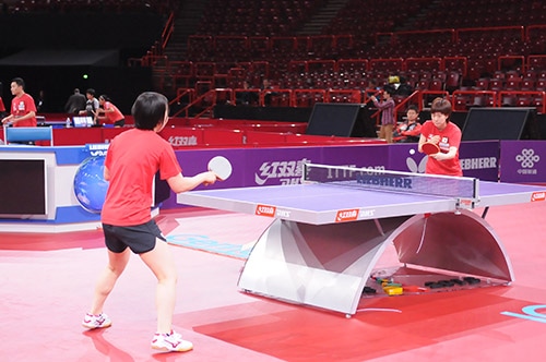 9日にフランス入りしてパリ近郊のアミアンで合宿をしていた日本チームが今朝パリに移動して、ベルシー体育館に姿を見せた。選手たちは基本練習に加えて、多球練習、サービス練習、ダブルス練習なども行った。リラックスした中にも緊張感を漂わせ、時間をかけて会場の感触を確かめた。