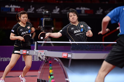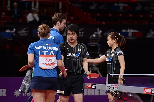 5月14日、大会2日目は男女シングルスの予選ラウンドに続いて混合ダブルスの決勝トーナメント1回戦が行われた。日本からは岸川・福原、吉村・石川、松平賢二・若宮の3ペアがエントリー。先陣を切ったのは岸川・福原の銅メダルペア。落ち着いた試合運びでイタリアペアを退けた。