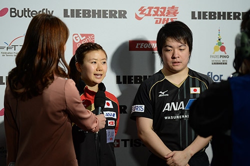 「しっかり勝ち抜くことができてほっとしています。事前に練習してきたことを出せました。1ゲーム目は硬くなって負けましたが、あとの4ゲームは自分たちで流れをつくることができ、明日につながる試合ができました」と福原。