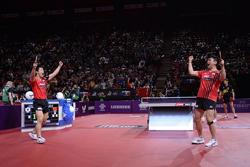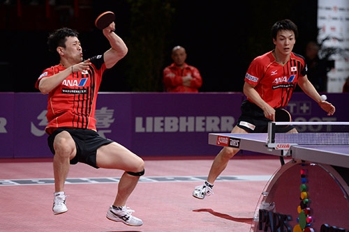 男子ダブルス3回戦で日本の張・松平賢二が陳杞・方博(中国)を破る快挙! 2011年ロッテルダム大会ベスト8の2人が再びベスト8入りを果たした。