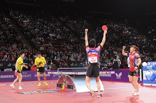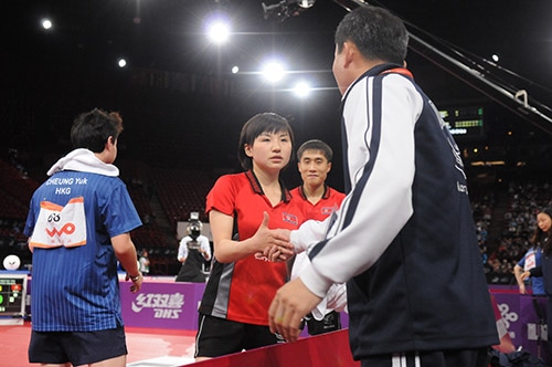 北朝鮮ペアは香港ペアに大逆転勝利李尚洙・朴英淑(韓国) 9,8,4,-8,8 王励勤・ラウ静文(中国)