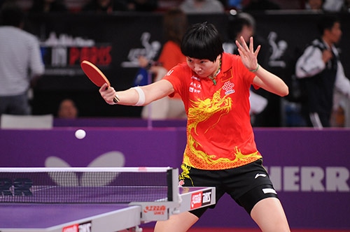 女子シングルス準決勝の第1試合はディフェンディングチャンピオン丁寧(中国)とオリンピック金メダリスト李暁霞の戦い。決勝進出をかけたこの戦いで李暁霞が丁寧を退け、世界卓球初優勝に向かって一歩あゆみを進めた。