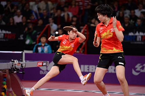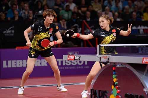 女子ダブルスの準決勝が行われた。女子ダブルスは中国からエントリーした3ペアが勝ち残り、残りの1席を勝ち取ったのが福原・平野ペアを破った馮天薇/ユ・メンユ(シンガポール)。シンガポールペアは敗れ、世界卓球2連覇中の郭躍・李暁霞と初優勝を狙う丁寧・劉詩雯が決勝進出を決めた。
