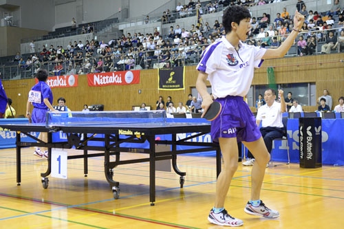続くダブルスは森本・吉村と丹羽・町の対戦。「ダブルスを取られたら流れが明治に行く。ここが勝負」と試合後の森本が語ったがその通りの超ハイレベルのラリー戦を展開。結果3ゲーム目を逆転で奪った勝負強さを発揮した森本・吉村が勝利し愛工大が明治大を下し決勝進出を果たした。