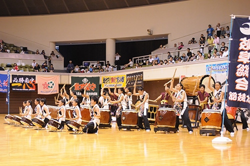 岐阜総合学園高校太鼓部のパフォーマンスで歓迎中学生たちの夏の全国大会「ゼンチュウ」が岐阜で開幕。厳しいブロック予選を勝ち抜いた代表校・選手たちが会場である岐阜メモリアルセンターに集合した。