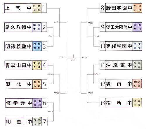 組み合わせは抽選の結果、上記のようになった。優勝候補は9連覇を狙う青森山田中、昨年決勝で青森山田に敗れた愛工大附属中、次いで野田学園中、明徳義塾中となるだろうか。今大会は強豪校の中でも、木造、高見、松山、大西らレベルの高い選手がそろえた愛工大附属中の強さが印象的だ。春の選抜に続き、青森山田の連覇を阻止する可能性は大きい。青森山田はエース羽佳、吉田が軸となるが、三部、及川の卒業による戦力ダウンの感は否めない。野田学園中は準々決勝で愛工大附属中と対戦する組み合わせとなったが、カデット王者の竹﨑の1点を突破口に持ち前の爆発力を発揮できれば優勝候補になり得るだろう。