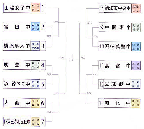 組み合わせは抽選の結果は上記の通り。10連覇に臨む四天王寺羽曳丘中が優勝候補筆頭に挙げられるが、昨年の決勝で四天王寺羽曳丘をラストまで追い詰めた山陽女子、春の選抜で優勝し30年連続出場の記録を達成した武蔵野中、昨年ベスト4の明徳義塾中、選抜2位の横浜隼人中が四天王寺羽曳丘中の対抗馬として挙げられる。