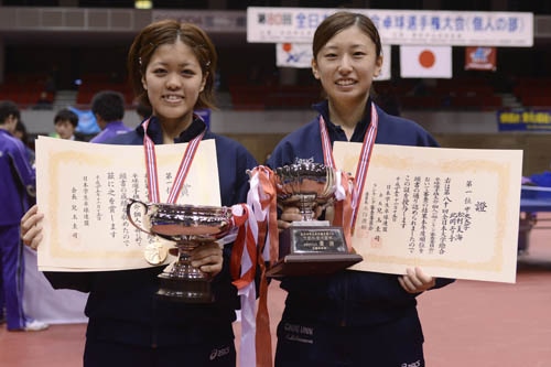 女子ダブルスは第1シードの北岡・松村(中央大)が北岡のカットと松村の攻撃という安定したプレーで危なげなく決勝に進出。北岡は根本とペアを組んだ1年生のときから4度目の決勝進出になるが、いずれも準優勝と悔し涙を飲んできた。一方の小鉢・鷲塚(東京富士大)はダブルスに定評のある東京富士大らしい息の合ったプレーで準決勝では平野・岡(東京富士大)の先輩ペアを破り決勝に進出した。
