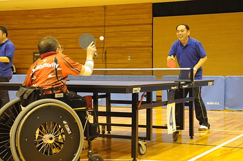 選手が役員・ボランティアと卓球をする交流会も行われた