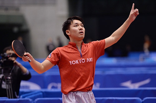 5回戦で吉村(愛知工業大)を破った吉田海偉は、フォアハンドドライブで御内のカットを打ち抜きベスト8に復活した。