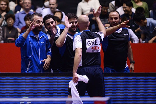 日本男子は初戦のギリシャ戦に敗れ黒星スタートとなった。トップの水谷はクレアンガの強烈なバックハンドに苦しみながらも、多彩なプレーでクレアンガを崩し日本が先制。続く岸川も安定したカット打ちで2対1とリードするが、切れたバックハンドカットとフォアハンドの攻撃で岸川の安定感のあるプレーを切り崩し、逆転勝ち。3番はパパゲオルギオウがワイドな攻撃で松平を振り回すが、松平もよく足を動かし食らいつく。しかし、最後までレシーブで苦しんだ松平がゲームオールで惜敗。日本は1対2とリードを許す。4番はサウスポーの水谷がジオニスのバック側にボールを集めて、しっかり足を動かして切れたカットを攻略し勝負はラストに。クレアンガは岸川の安定感のあるプレーに対して、高い打球点から強烈な両ハンドドライブを打ち込んで岸川をストレートで圧倒した。