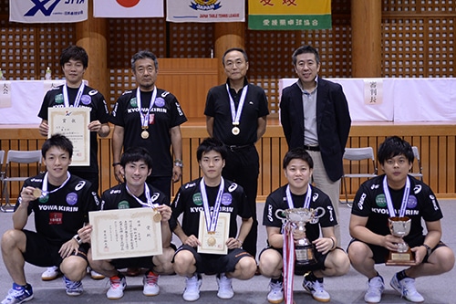 男子は、6連覇中の東京アートを準決勝で下した協和発酵キリンが決勝でシチズンに勝ち、7年ぶり通算10度目の優勝を飾った。協和発酵キリンは新入社員の上田と森本の2人が活躍。上田を単複で安定した力を発揮し、森本は東京アート戦で大矢を下す金星をあげるなど、チームの優勝に大きく貢献した。 また、エースの松平は、シェイプアップされた体になり、これまでに増して動きが良くなるなど、チームをけん引した。 「企業として東日本大震災の復興支援として、選手はこれまでに60回以上被災地をまわりましたが、そこで多くの方に応援してもらいました。今回の優勝で、その方々に少しでも恩返しができたのではないかと思っています。試合では、上田、森本の新人ががんばってくれました」と佐藤監督。 2位は昨年に続いてシチズン。安定した戦いで決勝に勝ち上がったが優勝には手が届かなかった。こちらも新人の加藤が思い切りのいいプレーで活躍。決勝では上田からマッチポイントを奪ったが勝ちきることができなかった。なお、3位には昨年に続いてリコーと東京アートが入った。