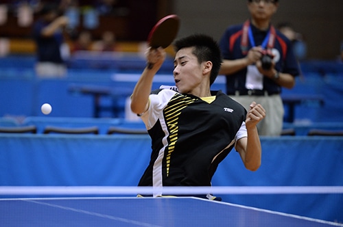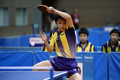 1番は愛工大附属が田中、城南が川村という2年生同士の対戦。田中が第1ゲームのジュースを接戦をものにすると、第2、第3ゲームは川村のバック側を突くドライブ攻撃で試合を優位に運び、3対0で勝利。トップバッターとして、チームに勢いをつけた。