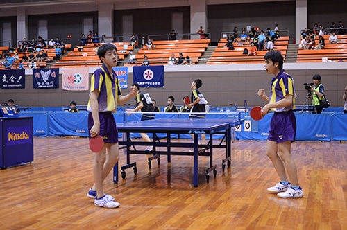 ダブルスは愛工大附属が太田・橋本、城南が日光・中谷という組み合わせ。序盤から愛工大附属ペアの猛攻が光り第1、第2ゲームを連取。優勝まで残り1ゲームと迫った第3ゲームは中盤に固さが見られたものの11対7で勝利。3対0で勝利して2年連続8回目の優勝に花を添えた。
