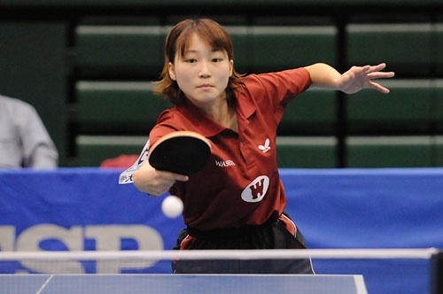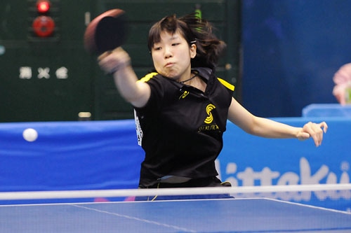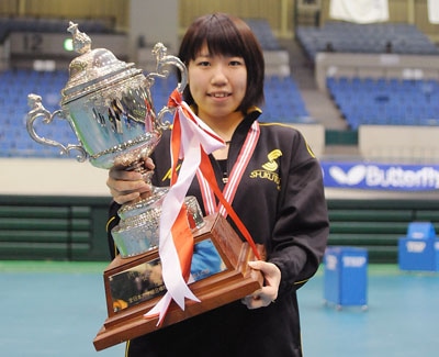 女子シングルスは優勝候補ナンバーワンの丹羽(淑徳大)が、威力のある両ハンドドライブに磨きをかけ、鈴木(専修大)、高橋(同志社大)ら全国タイトル保持者を落ち着いたプレーで退けて順当に決勝に勝ち上がった。
