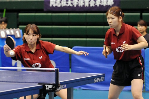 女子ダブルスは第1シードの小道野・高橋(早稲田大)が小道野の速攻と高橋の威力のあるドライブのコンビネーションで順当に勝ち上がり決勝に進出。対する長尾・竹本(神戸松蔭女子学院大)は左右の連係のよさと粘り強いプレーで昨年2位の小鉢・鷲塚(東京富士大)、丹羽・佐藤(淑徳大)ら優勝候補のペアを連破して決勝に進出。決勝は攻撃力のある早稲田ペアが3対1で神戸松蔭ペアを下して優勝。2年ぶりに同種目で早稲田大がタイトルを取り戻した。