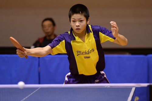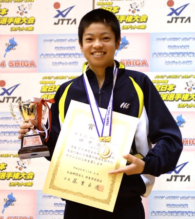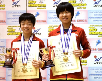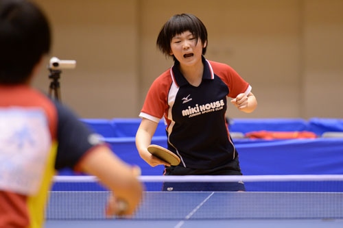 14歳以下女子シングルスは、準決勝で全中2連覇の早田を破った塩見(ミキハウス)と準々決勝で昨年の13歳以下チャンピオンの青木(ミナミラボ)を破った鈴木(ミキハウス)との同士打ち対決となった。フォア面表ソフトラバーの塩見は前陣でピッチの速いラリーで攻めるが、対する鈴木は塩見の持ち上げたボールをカウンターで狙い互角の勝負に。勝負は最終ゲームまでもつれたが、闘志を前面に出して戦った塩見が同級生対決を制して、ホープス優勝以来、2年ぶりの全国優勝を果たした。