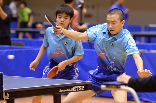 男子ダブルスは宇田・金光(JOCエリートアカデミー)と中橋敬人・遠藤碧人(湘工ジュニア・TTC浦和)との対戦となった。中橋・遠藤は左利き同士のペアで、大きなフットワークを駆使して決勝まで勝ち上がった。中橋・遠藤は0対2と後のないところから、動きの良さで粘り強さを発揮して2ゲーム連取。しかし、最後は宇田と金光の超カデット級のボールを抑えきれずに、宇田・金光が初優勝を決めた。