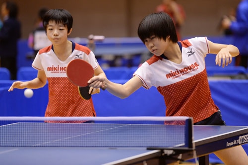 女子ダブルスは宮﨑翔・宮野彩未(ミキハウスJSC)と早田ひな・池田玲菜(石田卓球クラブ)との決勝となった。攻撃力では勝る早田・池田ペアだったが、レシーブなどの精度と豊富な練習量を感じさせる安定したプレーで、宮﨑・宮野が3対1で勝利を収め初優勝を飾った。