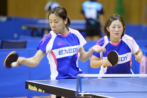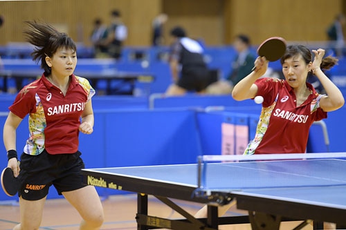 女子ダブルスを制したのは、天野・中島(サンリツ)。天野の速攻と、中島のパワーがうまくかみ合い、初優勝を果たした。2位には、ミスの少ないプレーで数々の接戦を切り抜けた玉石・中尾(エクセディ)が入った。
