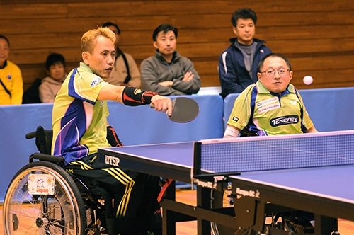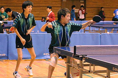 ダブルスは男子クラス1-5で吉田信一・岡紀彦のシングルス王者同士のペアが3連覇達成。決勝では若手成長株・土井兄弟の挑戦を受けたが、要所を冷静なプレーで締め、振り切った。男子クラス6-8を制したのは、佐藤泰己・武田宣久。3ペアの総当たりとなった決勝リーグ2試合はいずれもリードされてからの逆転勝ち。優勝に賭ける執念で他を上回った。男子クラス9-Sは、垣田斉明・永下尚也が優勝。シングルスの男子クラス10決勝を争った強打者同士のペアは、思い切りのいいレシーブからラリーに持ち込み、打ち勝った。