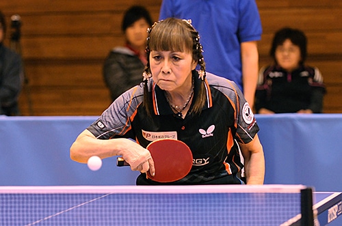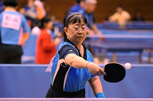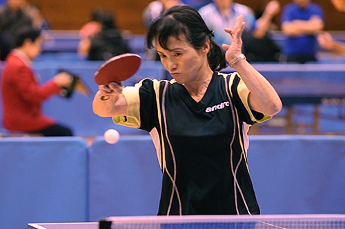 男子クラス5優勝の岡 女子クラス2-3はエントリーした3人中2人が棄権し、小澤摩由美が優勝。「試合したかったです」と小澤は表彰式で複雑な心境を吐露したが、ダブルスでは切れのあるプレーを連発していた。女子クラス4は吉海美代子が昨年に続いて連覇。ミスの少ない安定感抜群のプレーは同クラスで際立っていた。女子クラス5を制したのは、女王・別所キミヱ。別所は優勝後、「手を痛めて練習が思うようにできなかった」と怪我に見舞われたことを明かしたが、それでも攻守ともにすきのないプレーで9連覇を果たしたのはさすがの一言。
