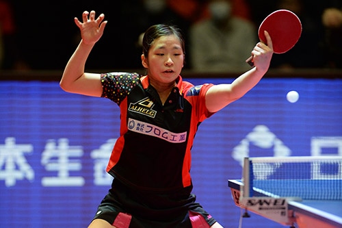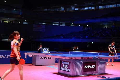 女子シングルス準決勝は、石川が1対3とリードされたところから前田に逆転勝利を収め、女王の強さを観客に証明した。一方の森薗はカット主戦型の石垣をシャットアウト。初の決勝進出を決めた。