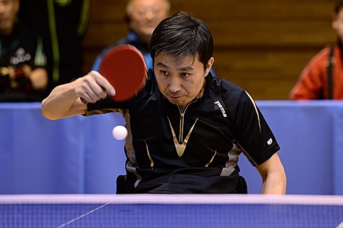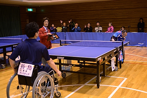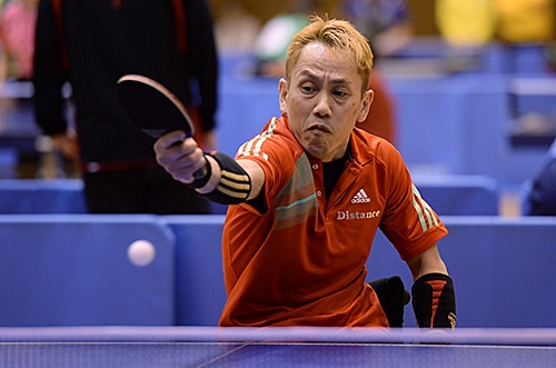 車いす男子G2の部では鋭いバックハンドドライブで勝ち進んだ渡邊剛(東京)が初優勝。決勝戦でも力強い攻撃で試合のペースを握り、チャンピオンの座をつかんだ。