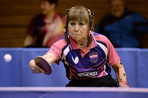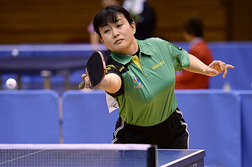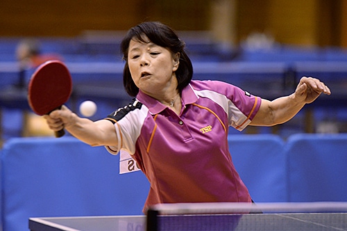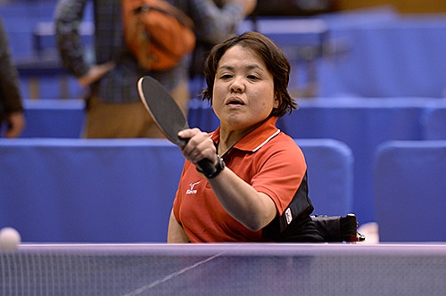 車いす女子G2の部のチャンピオンは須藤泰子(愛知)。接戦が続いた予選リーグを勝ち上がると、決勝リーグではフォアハンドでの攻撃がさえわたり、見事初優勝を果たした。