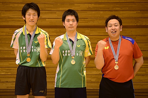 優勝は一昨年の覇者の吉田信一(東京)。予選リーグの第1試合こそ、苦戦を強いられた吉田だったが、試合を重ねるにつれて調子を上げた。決勝では得意のバックハンド強打で試合を優位に進め、普段から練習を共にする長島に3対1で勝利した。