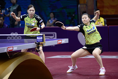 ドイツペアは強力な両ハンド攻撃を武器に、レシーブでもチキータを使うなど、男子のようなプレー。一方、日本ペアは前陣でコースを突いて主導権を握る。序盤はドイツペア優勢で進むが、日本が連続攻撃でジュースを制して12-10で先制。第2ゲームは日本ペアが台上で先手を取って圧倒。11-4で日本ペアが連取。