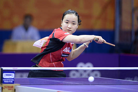 陳思羽(中華台北)は昨年、4戦4敗と伊藤にとっては分の悪い相手だが、第1ゲームはバック対バックの展開で伊藤が先手を取り11-4と好スタート。しかし、第2ゲームは台から少し距離を取った陳思羽が5-0とスタートダッシュ。逃げ切った陳思羽が取り返して1対1。第3ゲームは、台から出たボールを積極的にフォアハンドで回転をかけた伊藤がリード。10-5から10-8まで追い上げられるが、レシーブで思い切ったバックフリックを決めて2対1。波に乗った伊藤はフォアハンド強打でエースを連発して11-2と王手。第5ゲームは陳思羽リードで進むが、8-6から8-8に追いつかれたところで陳思羽がタイムアウト。伊藤は攻守のメリハリの利いたプレーで逆転してベスト16入りを決めた。