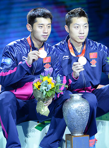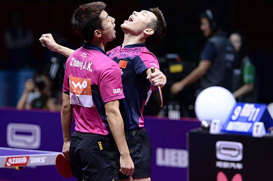 世界卓球2015蘇州大会7日目、女子シングルス決勝に続いて男子ダブルス決勝が行われた。許昕/張継科と樊振東/周雨の同士打ち対決は先輩の許昕/張継科が実力を発揮して初優勝を飾った。