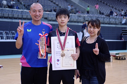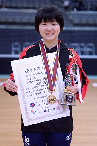 3位には、中学生離れしたパワフルな両ハンド攻撃を見せた浅津碧利(稲付)と、リズミカルな速攻が魅力の1年生・手塚崚馬(明徳義塾)が入った。【女子シングルス】塩見真希(四天王寺羽曳丘)が優勝