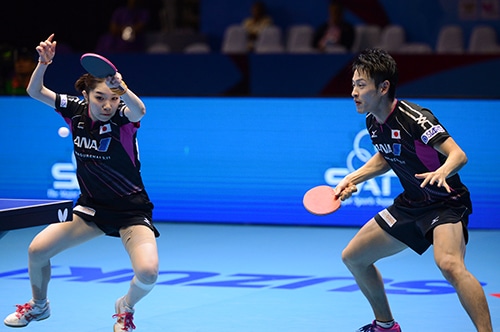 混合ダブルス準決勝に大島/若宮が臨んだ。「奇数のセットは回りが良かったのでチャンスがあった」と試合後に二人が語ったとおり、第1ゲームは優位な展開で試合を進めて先制点を挙げた。しかし、第2ゲームを落とすと、続く第3、第4ゲームも失い、1対3と追いつめられた。第5ゲームこそ、接戦をものにして奪ったが、最後は中国ペアの攻撃を止めることができず。決勝進出とはならなかった。試合後、大島は「僕のサービスが樊振東にチキータされて失点につながることが多かったので、サービスの精度を高めていきたい」と語った。一方の若宮は「こちらが不利な回りのときに思い切ってせめて行ければ良かった」と試合を振り返り、課題を口にした。