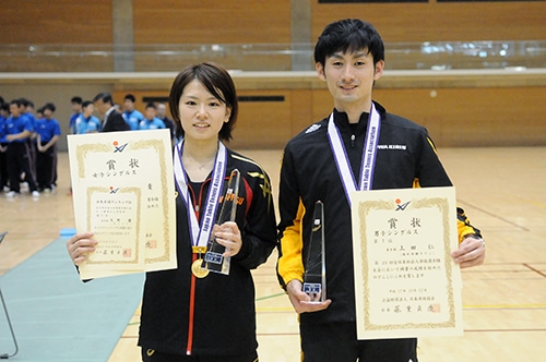 男子シングルスは社会人2年目の上田仁(協和発酵キリン)が初優勝を遂げた。昨年は足の負傷でこの大会を欠場し、今回が実質的な初出場になった上田。その無念を晴らすかのような攻めのプレーで優勝へと突き進んだ。動きのキレや打球の質の高さは出場選手の中でも抜きん出ており、文句なしの優勝といっていいだろう。